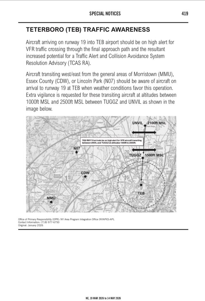 The publication of this Chart Supplement Special Notice represents the first step in communicating, quantifying and mitigating the high prevalence of TCAS Resolution Advisories (RA) in the airspace surrounding KTEB. TUG encourages flight crews to exercise the highest levels of vigilance in the areas described and depicted, particularly when Teterboro operates on a south flow. Because this Chart Supplement Special Notice is difficult to find, we’ve attach the document below.